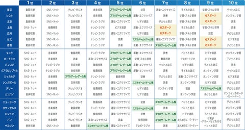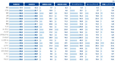 さらに、動画配信サービスの利用率は全都市で高く、「フードデリバリー」は東南・南アジアで特に人気があります。