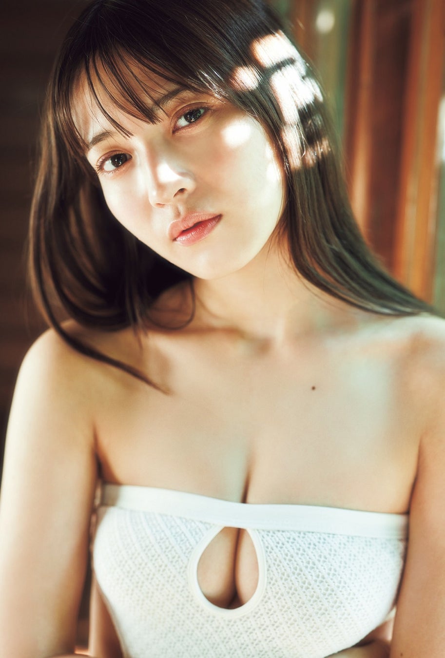 - 表紙には沢口愛華が登場し、可愛らしいマフラーを巻いた白のチューブ水着姿