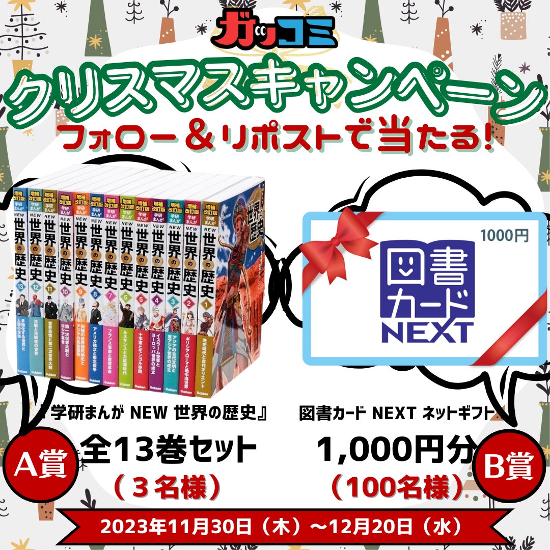 A賞では『学研まんが NEW 世界の歴史』全13巻セット(3名様分)、もしくはB賞では図書カードNEXTネットギフト1,000円分(100名様分)が抽選で当たります。