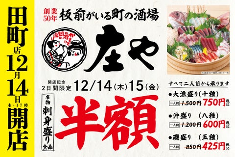 開店を記念して2日間限定で天然鮮魚の刺身盛り合わせを半額で提供します。