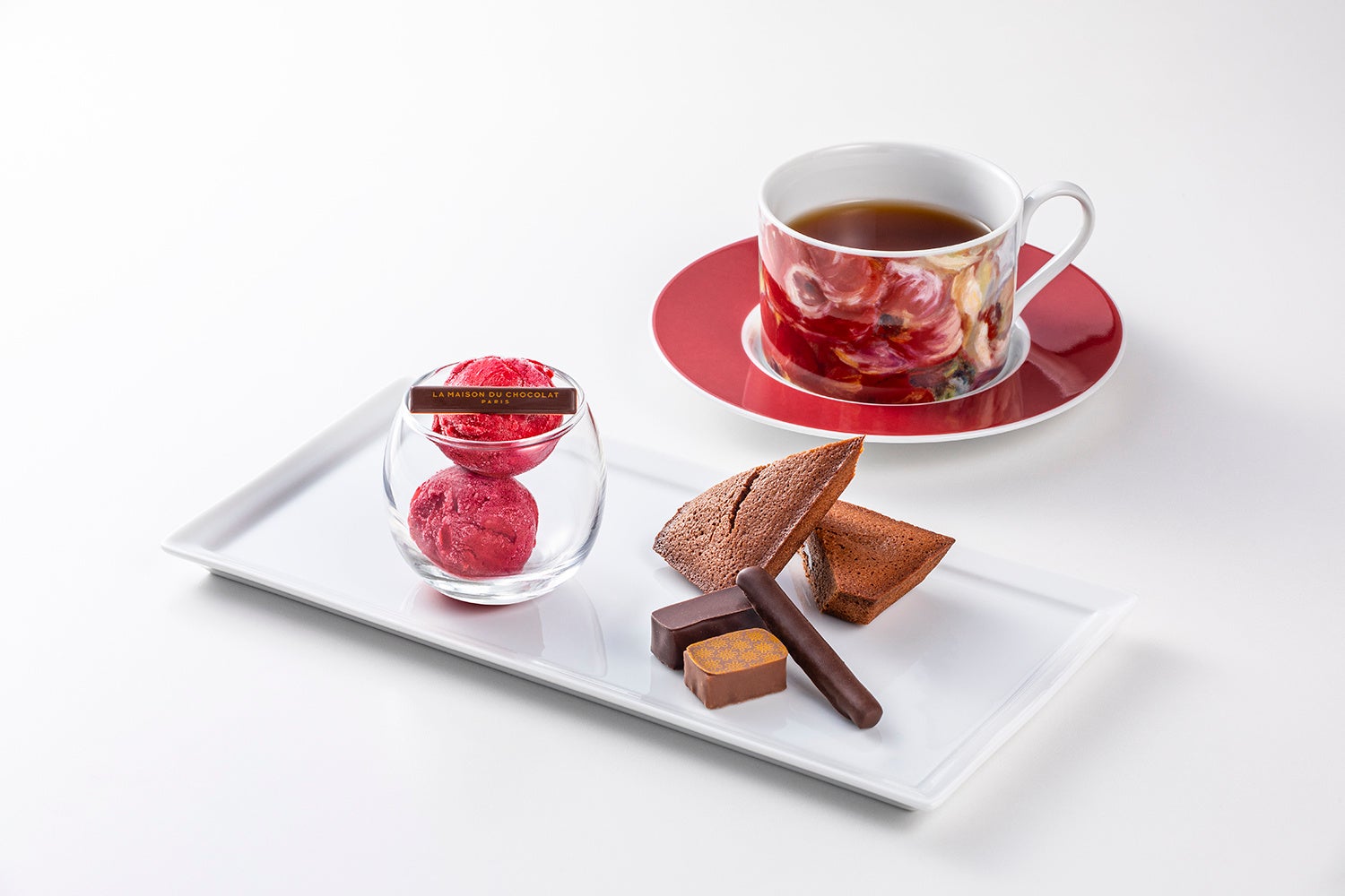 メニューには2種類のボンボン・ドゥ・ショコラとオランジェット、フィナンシェ、ソルベのセットプレートが含まれており、特に注目すべきは2023年のクリスマスコレクションからの「プラリネ マイス」です。