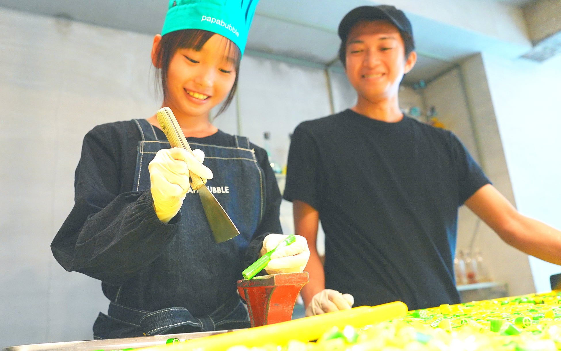 毎日5回のキャンディパフォーマンスでジャンケンに勝ったお子様2〜3名が、キッチン内で職人のようにカット体験ができます。
