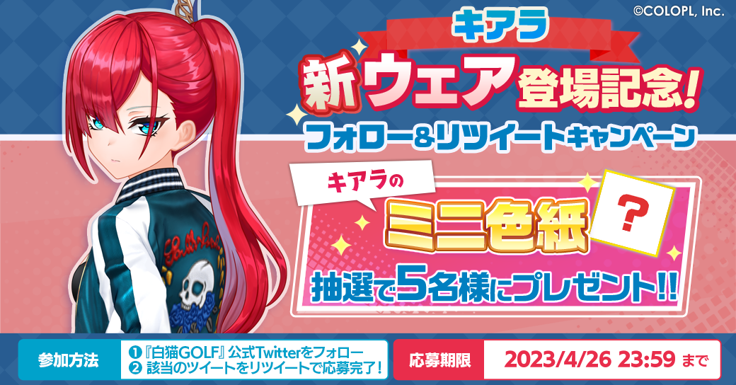 株式会社コロプラ(代表取締役社長:宮本貴志、本社:東京都港区、以下「コロプラ」)は、スマートフォン向けゲーム『白猫GOLF』にて、「キアラ(CV:阿澄 佳奈)」の新ウェアが登場したことをお知らせいたします。