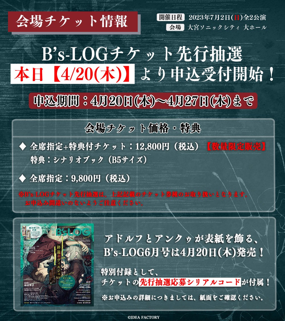 本日発売のB’s-LOG6月号にチケットの先行抽選応募シリアルコードが付属しています!