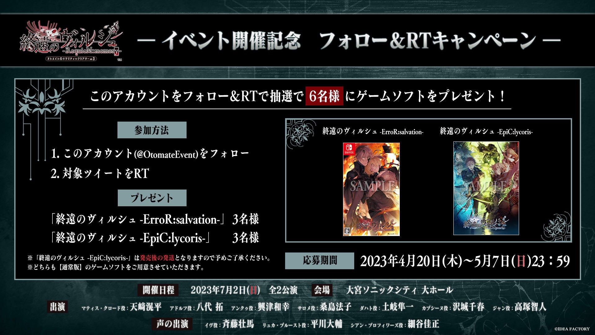 オトメイトが贈る朗読イベントシリーズ第3弾「終遠のヴィルシュ」本日より、B‘s-LOG先行抽選申込受付を開始!Twitterにてイベント開催記念キャンペーンも実施中!