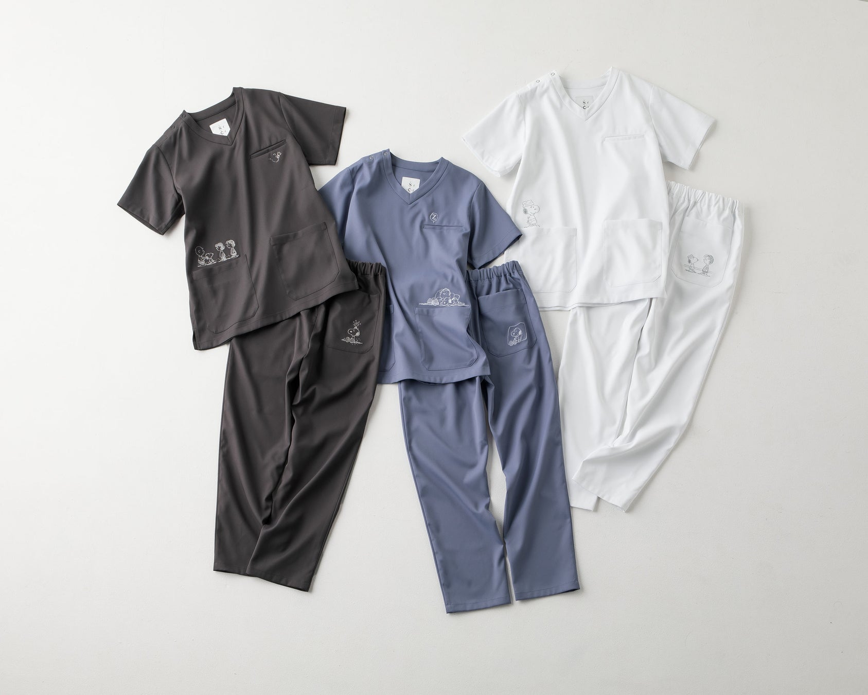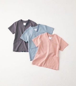 スクラブはオフホワイト・ブルー・グレーの3色で、大人っぽいデザインになっています。