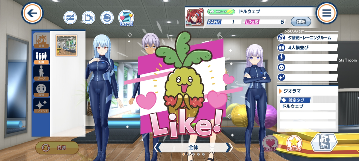 訪問先のジオラマではドルフィンが着ている衣装やアクセサリー、ポーズ、ジオラマ背景などを見ることができます!また、訪問したジオラマを「お気に入り」にできたり、「Like」を送ることができたりします。