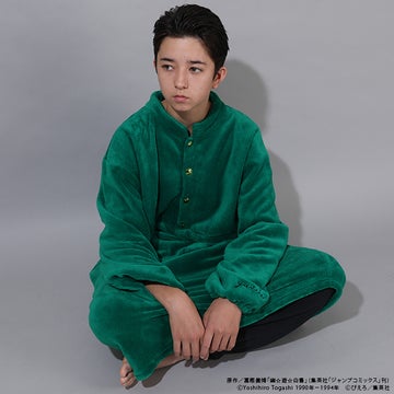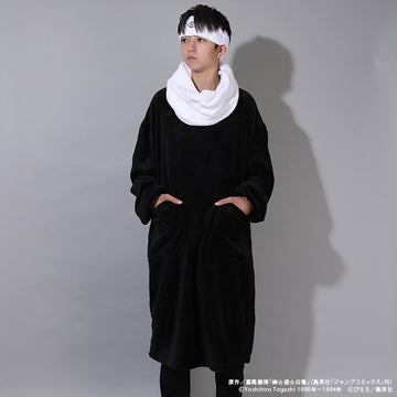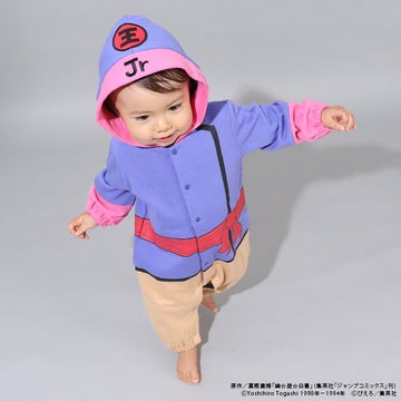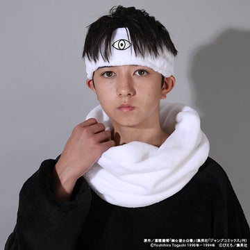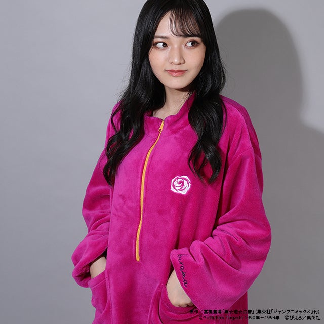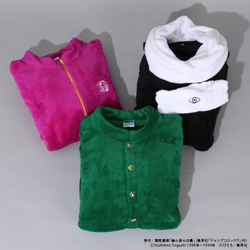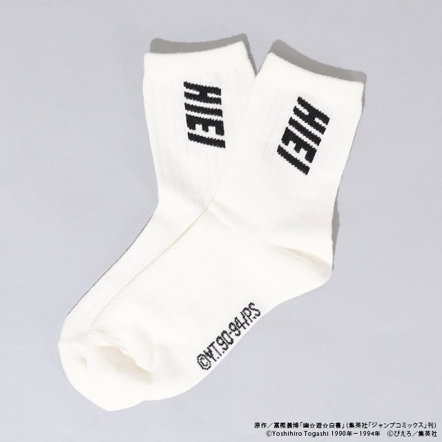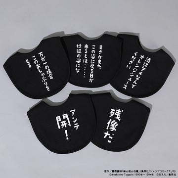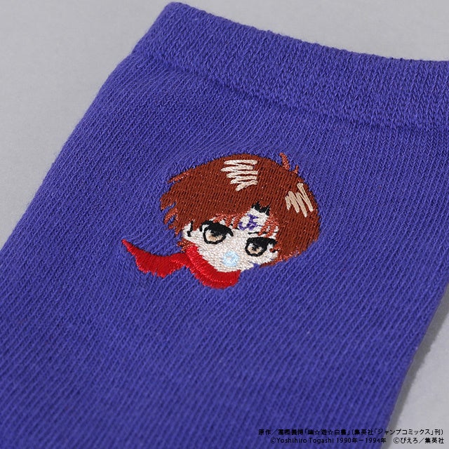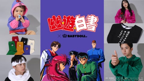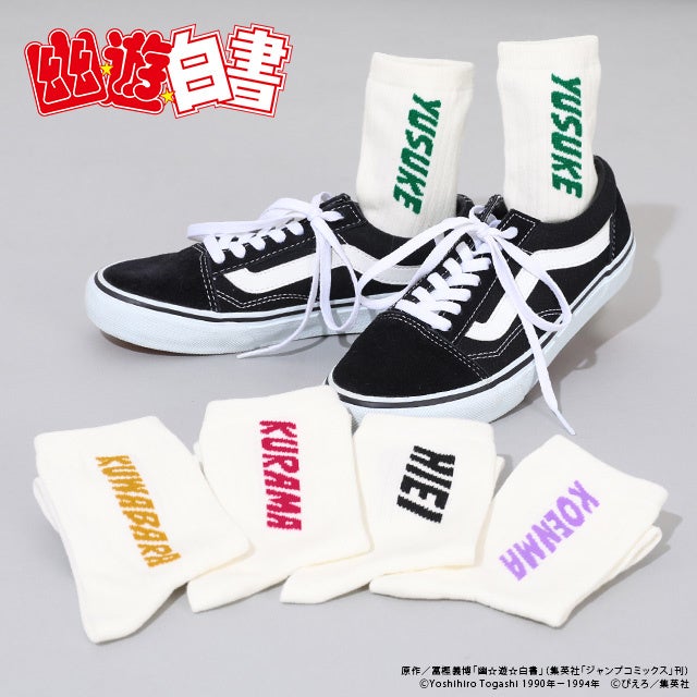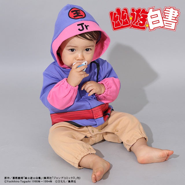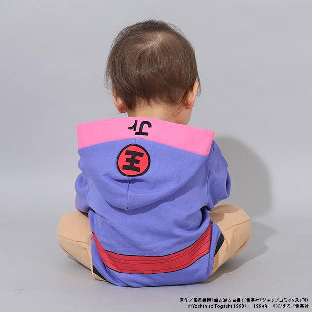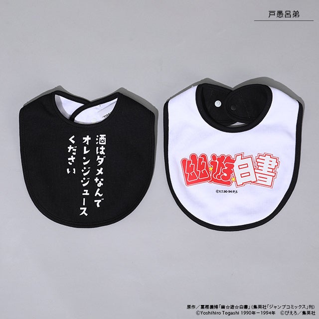 ベビー用のなりきりロンパースや名言プリントのスタイ、大人用の着る毛布、ネーム入りソックスや刺繍ソックスなど、幽助や蔵馬などのキャラクターがデザインされています。