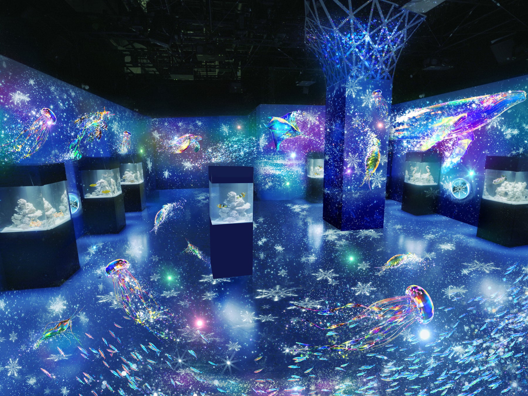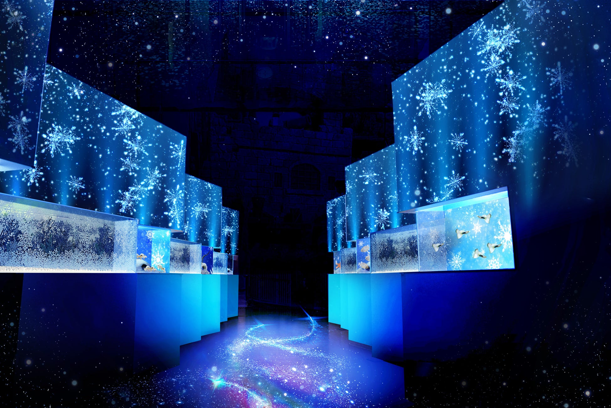 水槽展示エリアでは、美しい生きものたちが雪の結晶とダイヤモンドの輝きに包まれて展示されます。