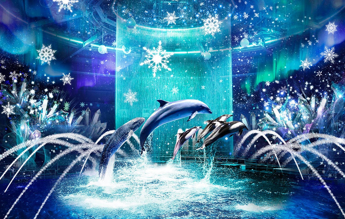- 冬季限定、雪、氷、オーロラ、生きもの、エントランス、雪の結晶、水槽展示エリア、ダイヤモンド、カフェバー、ドリンク、イルカ、ジャンプ、ドルフィンパフォーマンス、開催期間、入場料、公式ウェブサイト