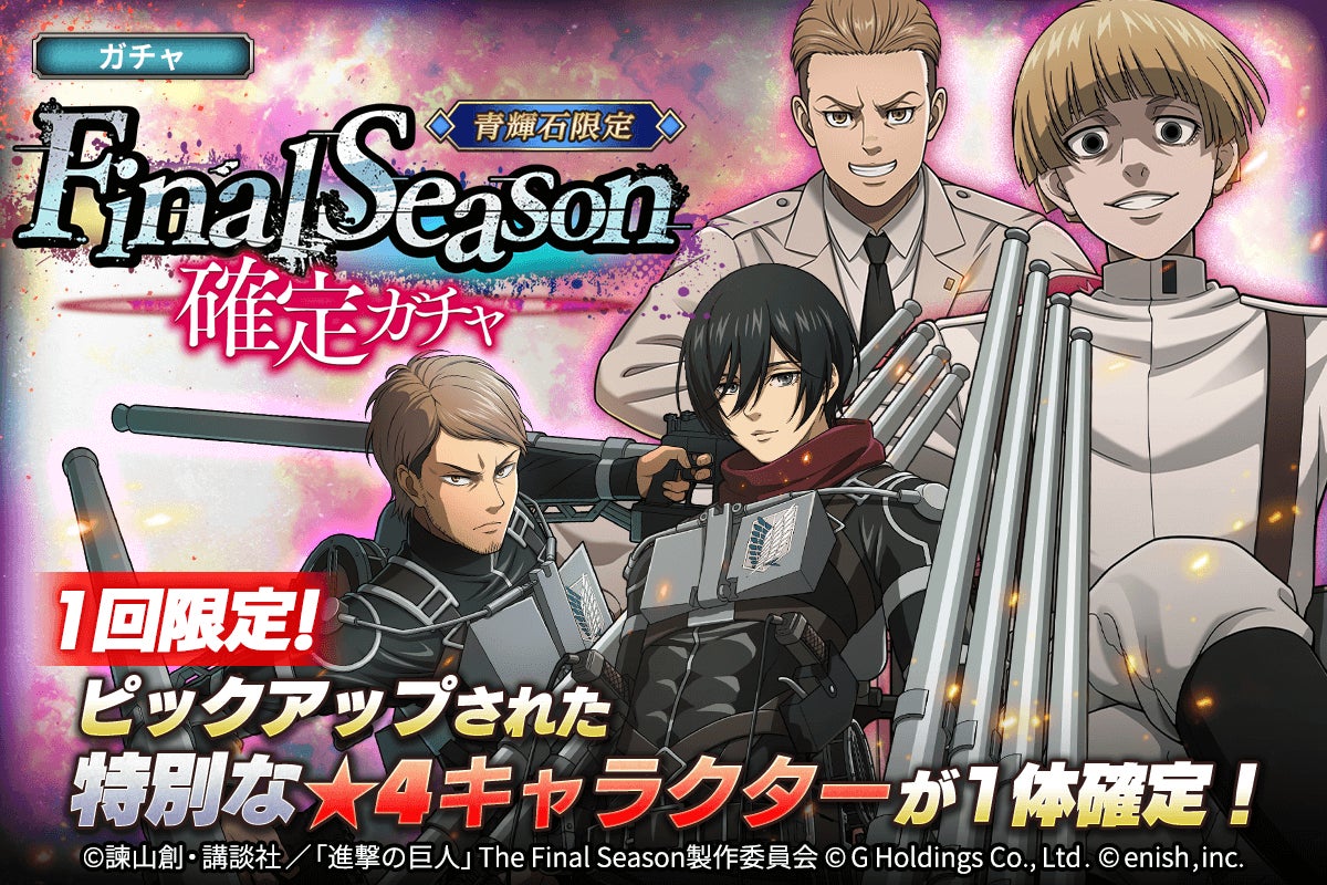 - 「Final Season確定ガチャ」も同時開催。ファイナルシーズンモチーフの団員達がピックアップされたガチャ。プレイヤーはエレンやミカサたちとともに調査兵団の一員となり、強大な巨人に立ち向かうスマートフォンゲーム最新作