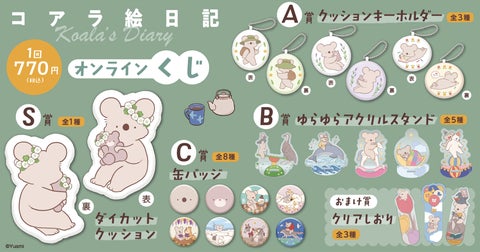 この機会をお見逃しなく!商品ラインナップは、S賞のダイカットクッション、A賞のクッションキーホルダー、B賞のゆらゆらアクリルスタンド、C賞の缶バッジの全種類です。