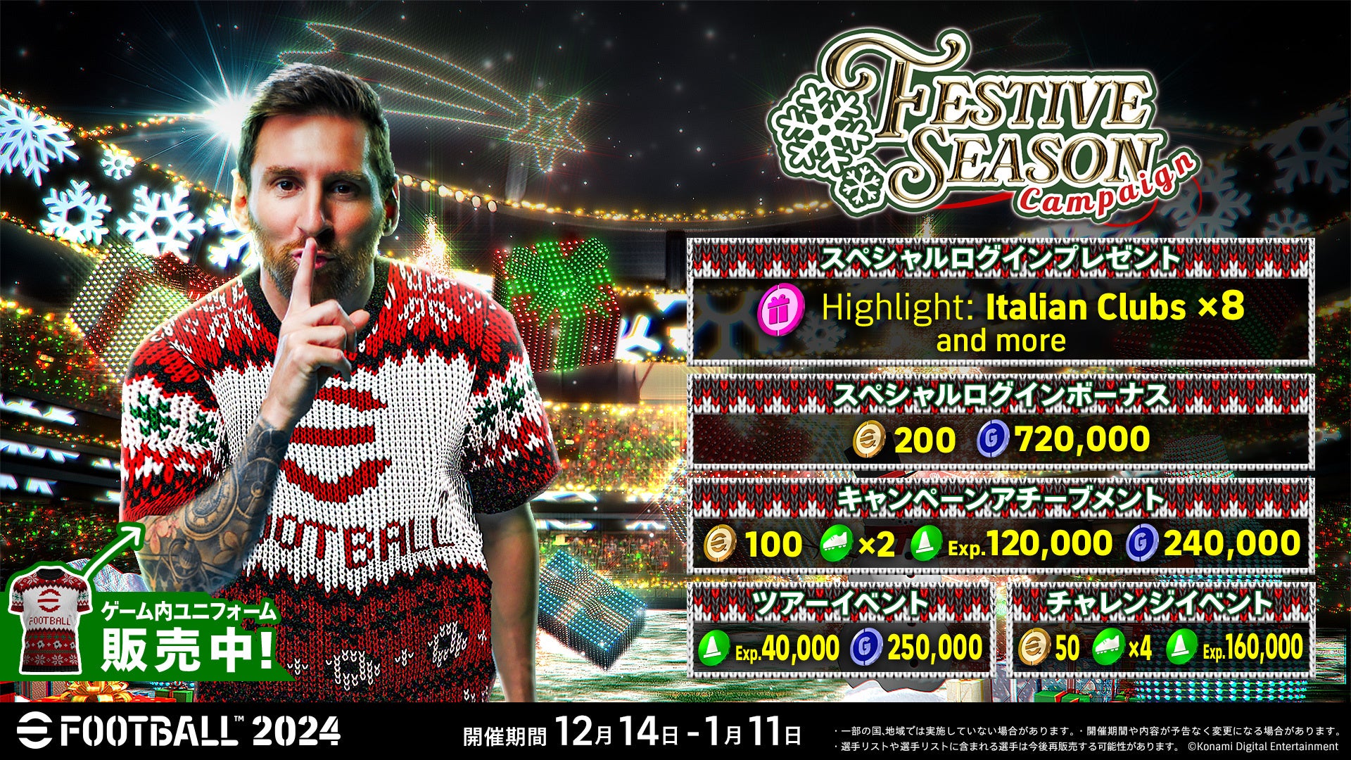 さらに、『eFootball™ 2024』では「Festive Seasonキャンペーン」も開催され、さまざまな特典が用意されています。