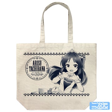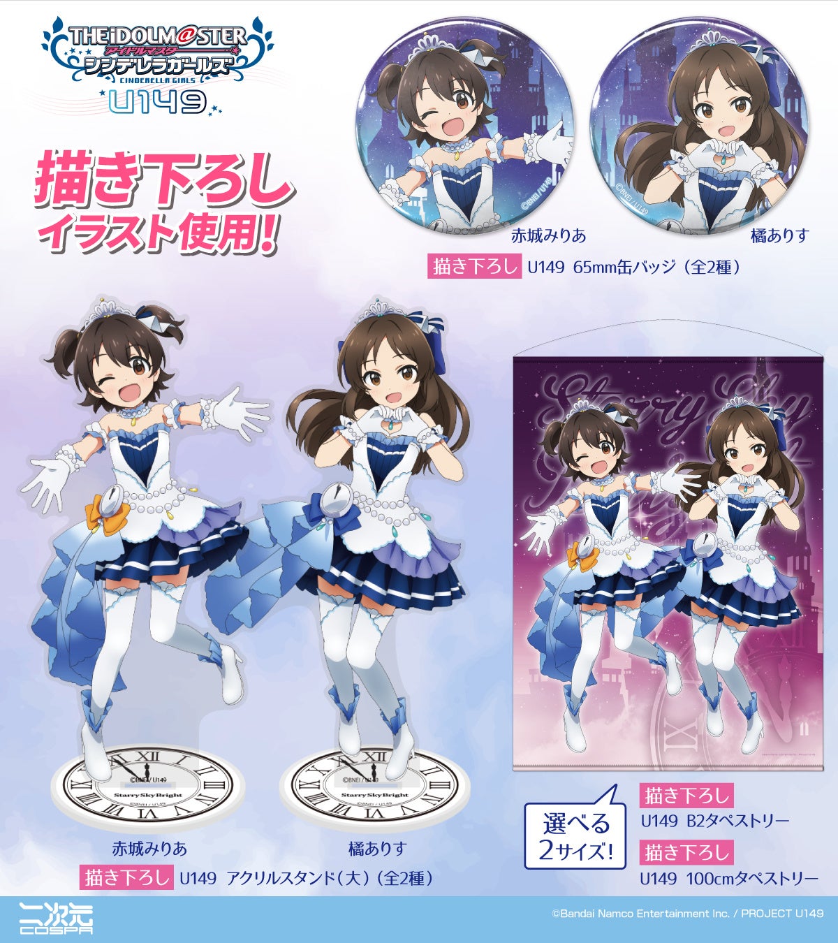 - 橘ありすと赤城みりあがスターリースカイブライトの衣装を着たアクリルスタンドやタペストリー、缶バッジ、Tシャツ、トートバッグなどがあります