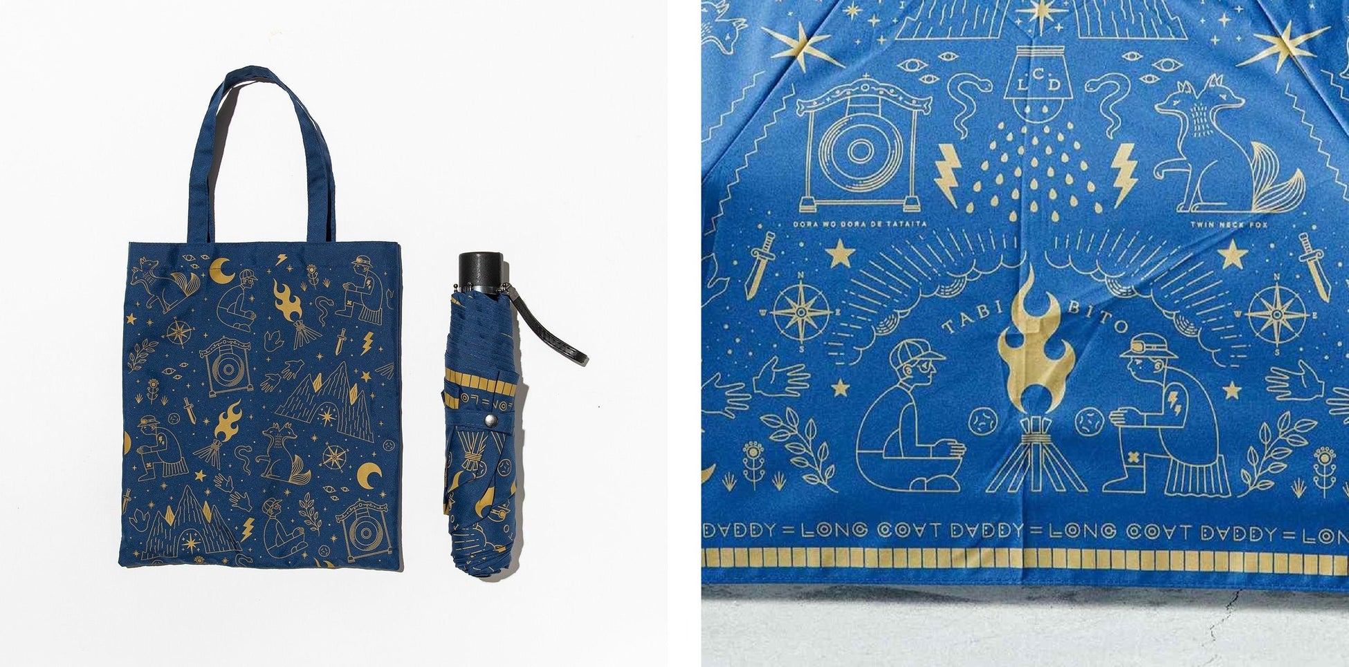 • ロングコートダディの折りたたみ傘は、コント『旅人』をモチーフにしたデザインで、サイズ調節ができる収納袋も付いている