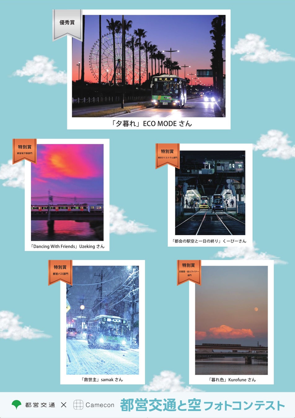 このタイアップ企画では、都営地下鉄、都営バス、東京さくらトラム、日暮里・舎人ライナーの魅力を伝えるため、応募作品をオリジナルポスターにしました。