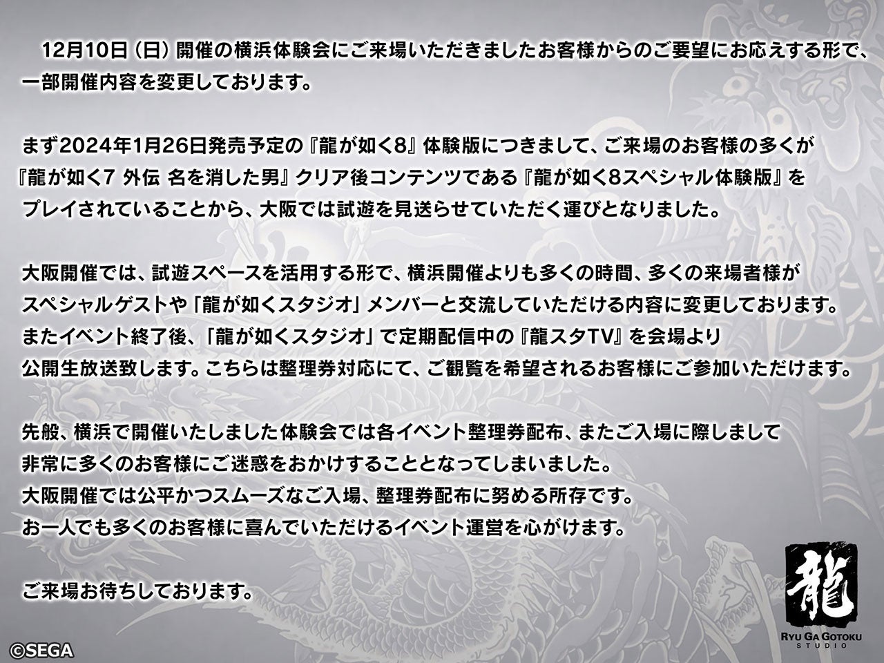 ただし、「龍が如く8」の試遊は見送ることになりました。