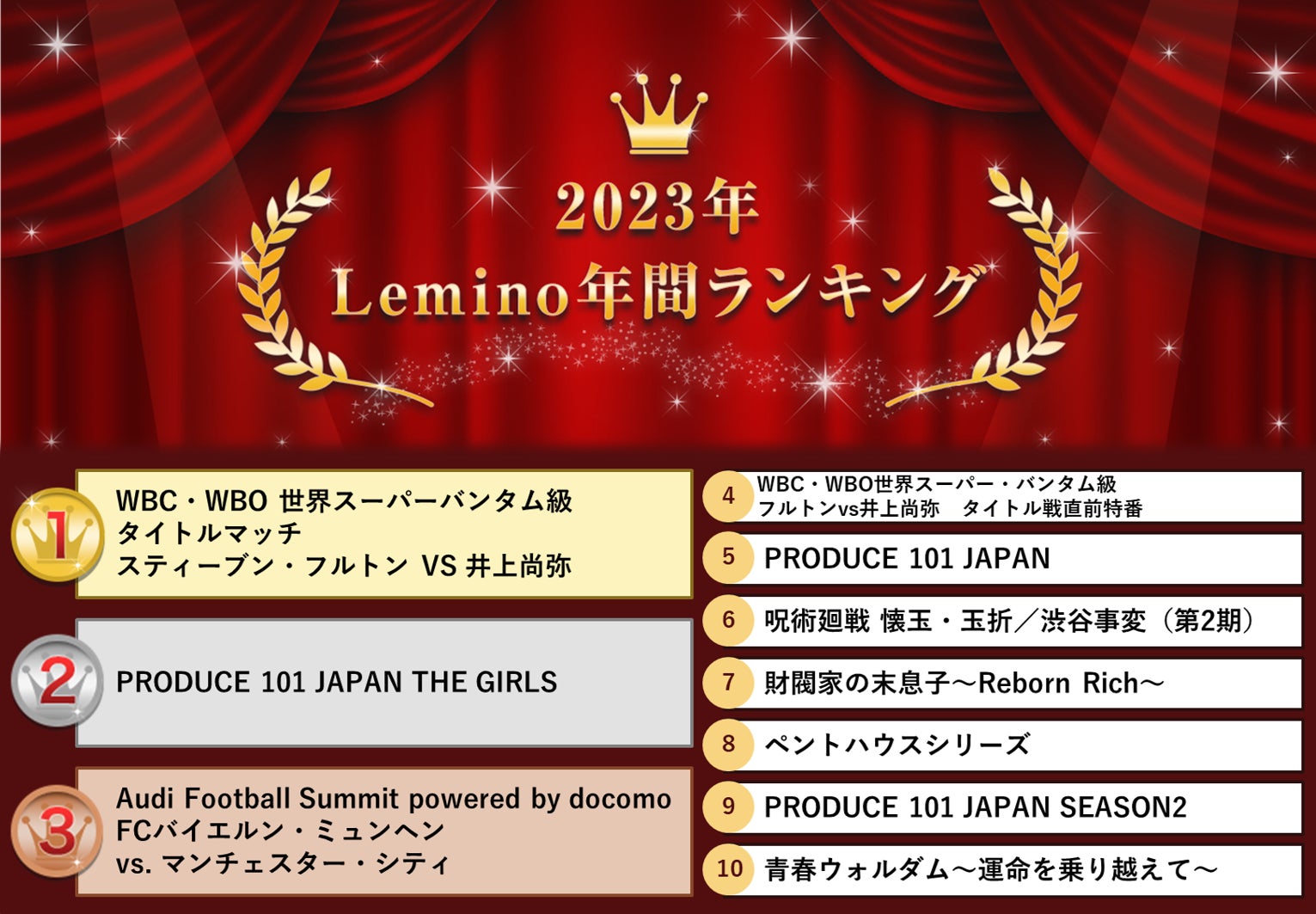 Leminoの総合ランキングで1位に輝いたのは、「WBC・WBO 世界スーパーバンタム級タイトルマッチ スティーブン・フルトン VS 井上尚弥」でした。