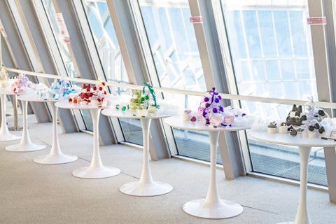 梅田スカイビル・空中庭園展望台40階には、マカロンカラーで統一されたテーブルが並びます。