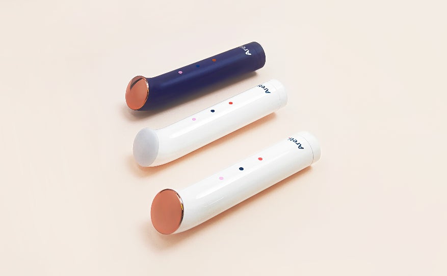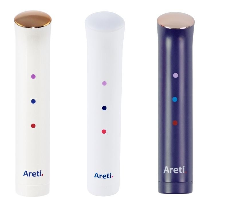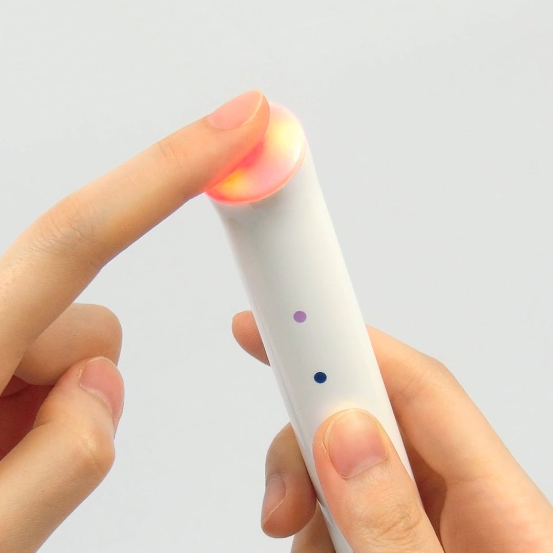 美顔器はスティックタイプで、赤、青、紫色のLEDを使用し、温熱と微振動機能を備えています。