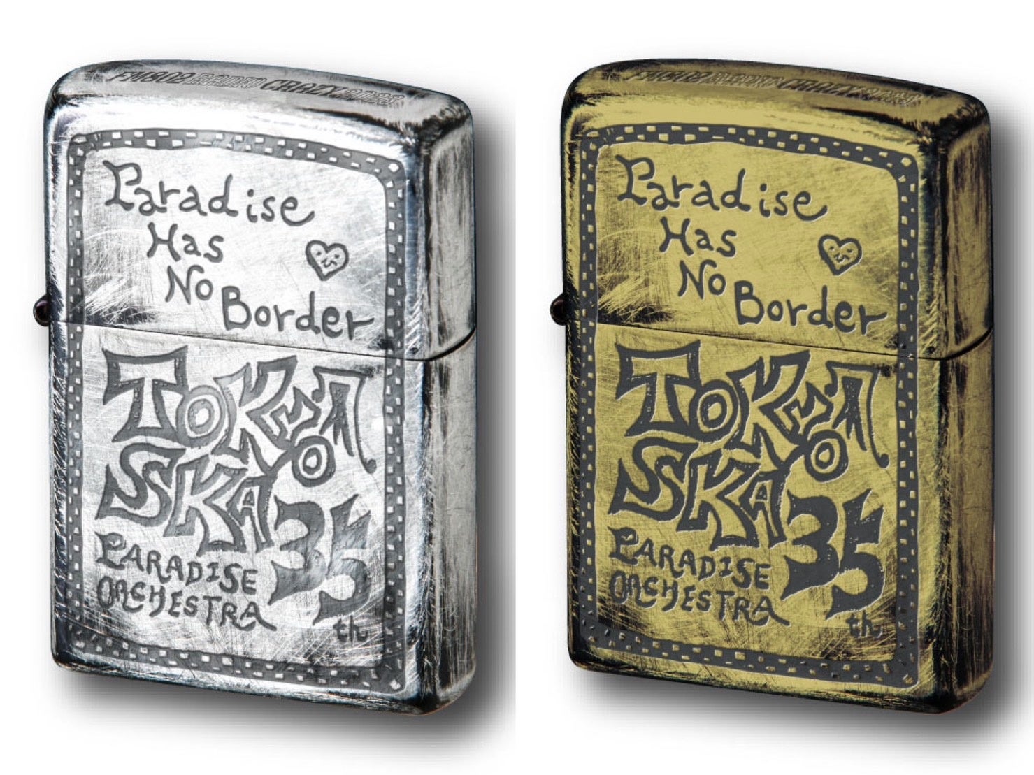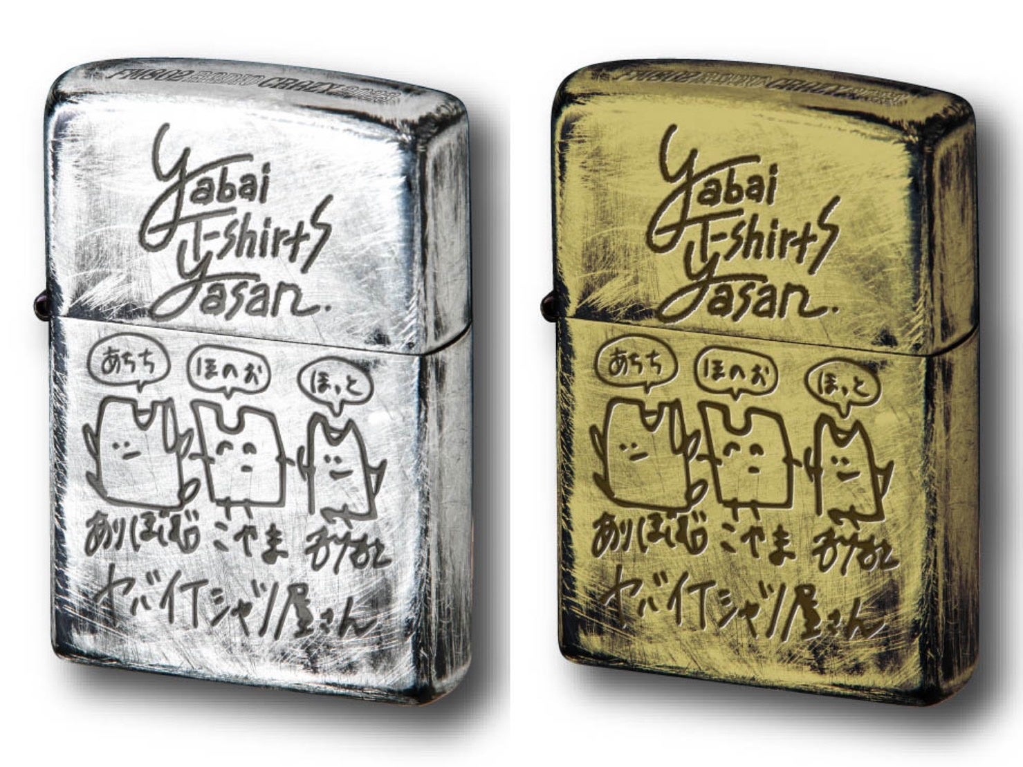 両バンドのメンバーが手書きでデザインしたZIPPOには、傷や剥がし加工が施され、ニッケルユーズド(銀色)と真鍮ユーズド(金色)の2色展開となっています。