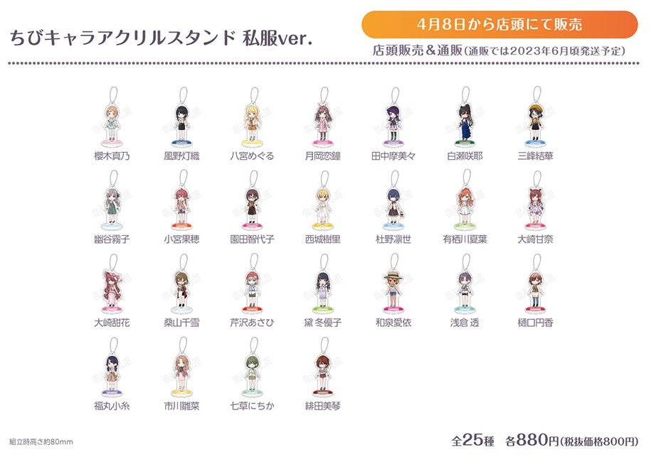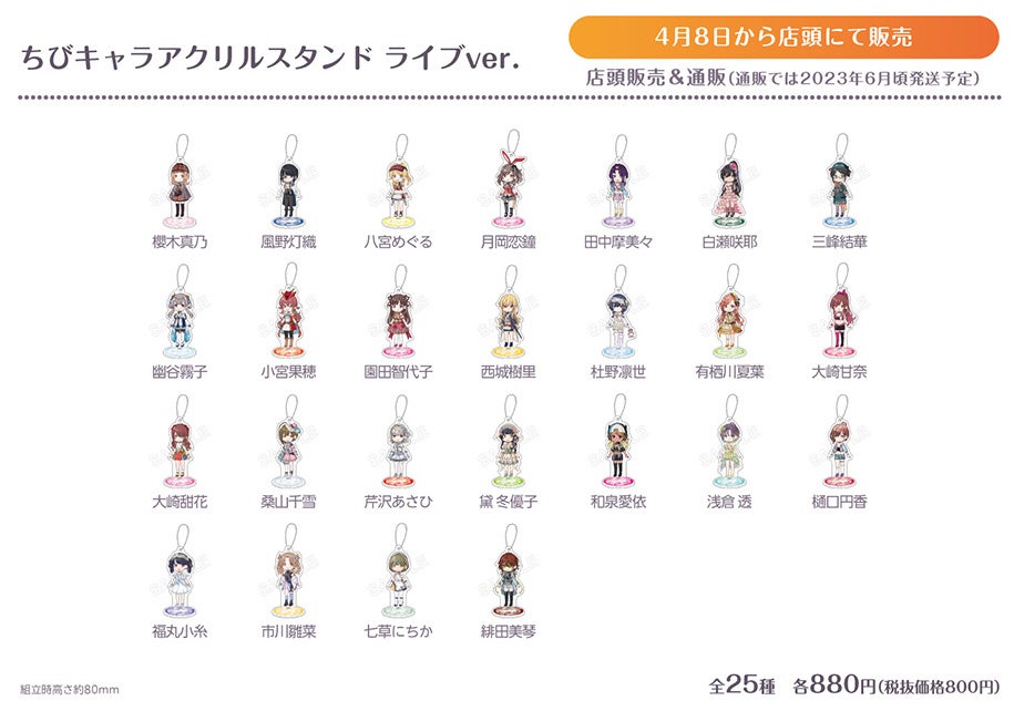 - ライブver.と私服ver.があり、全25種類。アクリルスタンドと専用の台座がセットになっており、組立時の高さは約80mm。
