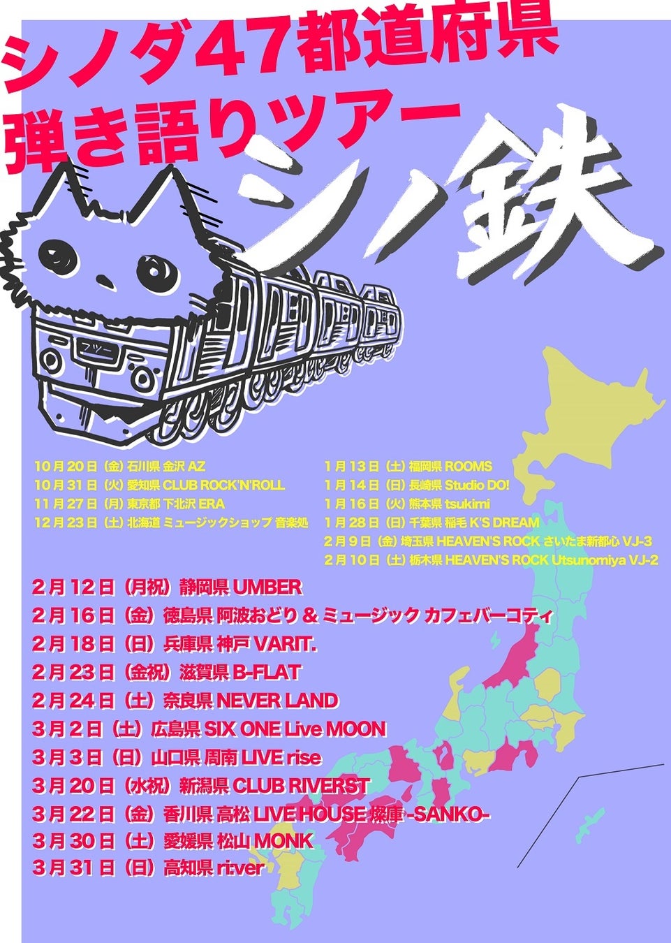 ヒトリエのギターボーカル、シノダによる弾き語りツアー「シノ鉄」の第2弾日程が発表されました。