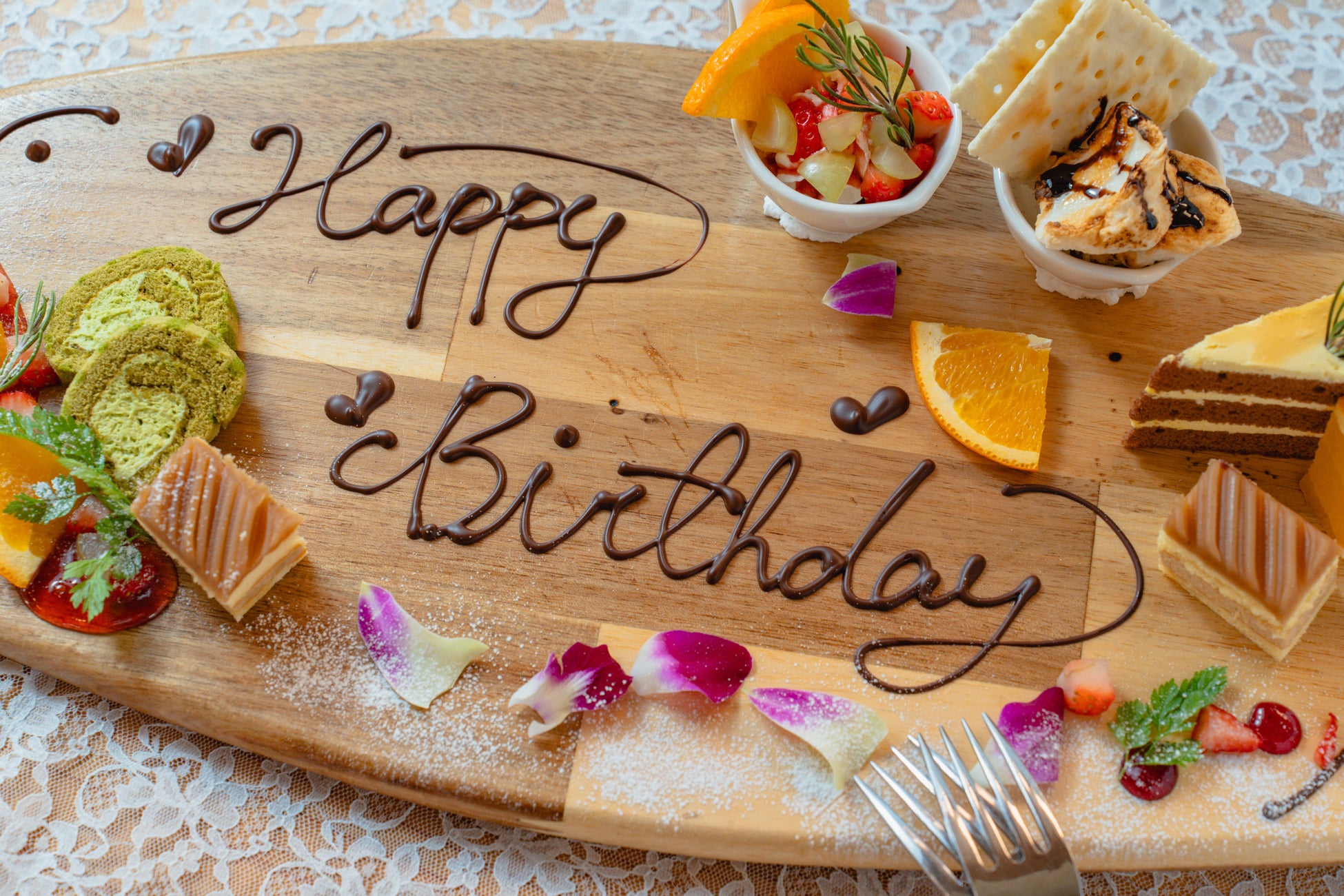 - ソフトドリンク、WDPプチデザート、お菓子の詰め合わせ、チェキ、お祝いプレート