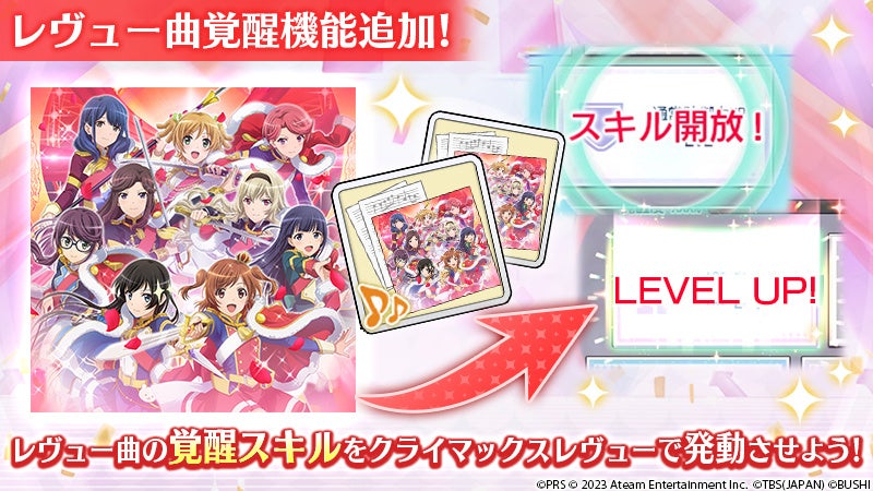 最大340連分ガチャが無料で引けるほか、レヴュー曲機能が大型アップデートされ、新たな育成要素「覚醒スキル」が追加された。