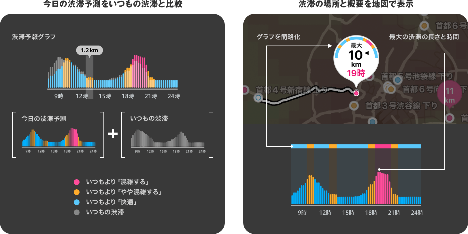 現在提供している「渋滞マップ(高速)」や「一般道マップ」上の渋滞予測情報は、渋滞長10㎞のように絶対値を元にした情報のため、例えば同じ10kmの渋滞でも、いつもより渋滞している場合としていない場合とでは、出発するかの意思決定が異なってくるのでは、と考えました。そこで、出発前に天気予報のように渋滞予報を確認し、混まないルートや渋滞ピークを避けた時間帯を選んで移動することができるよう、今日の渋滞がその道路の「いつもの渋滞」と比較してどうなのか、を感覚的に把握できる機能を開発いたしました。