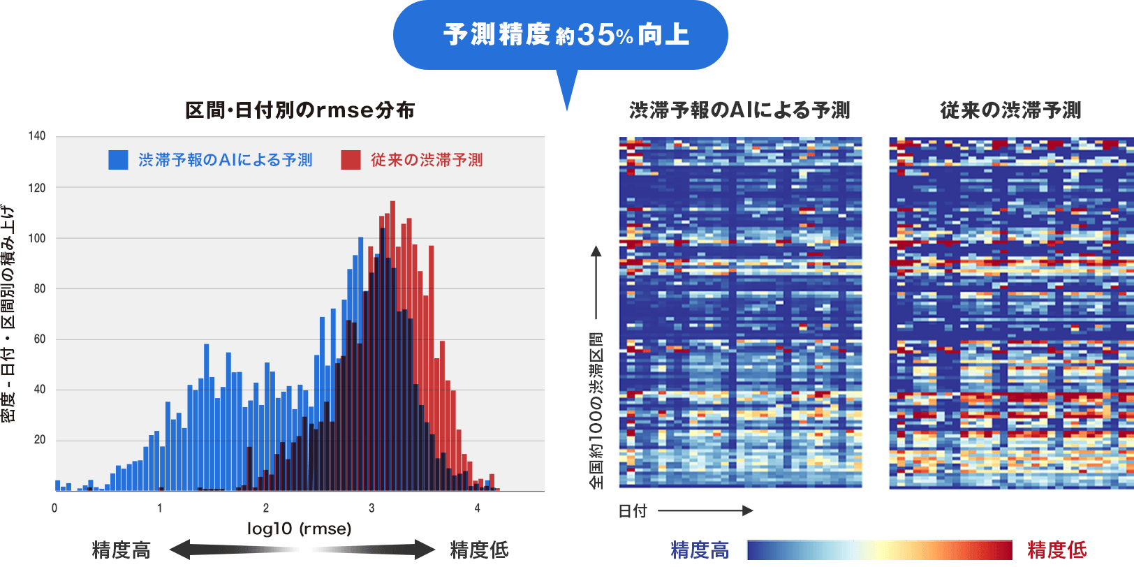 AIを活用した渋滞予測の精度は、従来の渋滞予測技術を使った場合に比べて、約35%向上している。