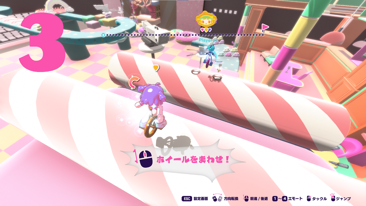 最大4人で対戦する一輪車おじゃまレースゲームで、マウスホイールを使って一輪車を転がし、ライバルたちに体当たりする。