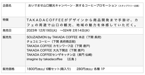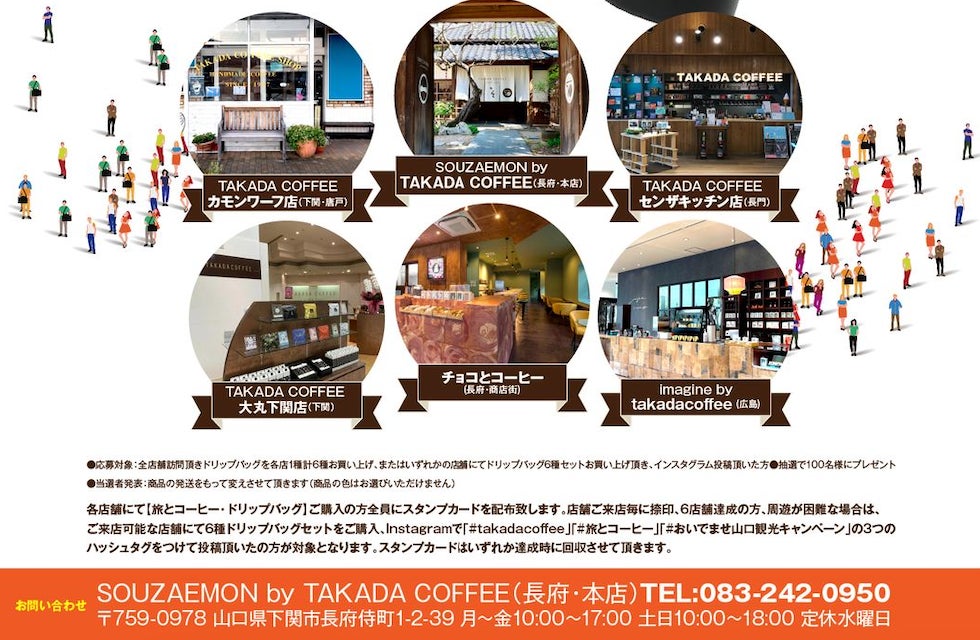 このTAKADA COFFEEでは、山口の観光資源を活用したオリジナル珈琲を提供しており、スタンプラリーキャンペーンを実施します。