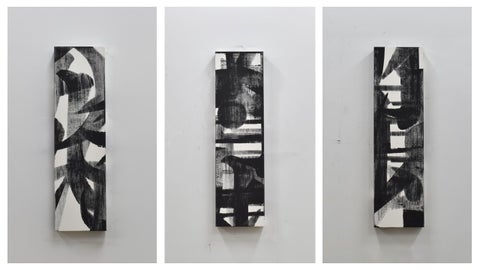 坪本は愛媛県の歴史教育で知った「顔のない碑」という石碑に強いインスピレーションを受け、ステンシルを使って意味の読み取れない形の作品を制作しています。
