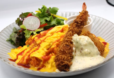 ケチャップライスにとろとろの卵、エビフライや白身魚フライがのっており、ケチャップタルタルソースで仕上げられています。
