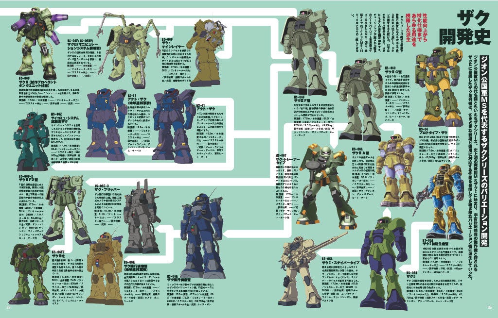 ジオン公国軍と地球連邦軍のMS開発に焦点を当て、ザク・グフ・ドムなどの開発や水陸両用MS、ニュータイプ専用機動兵器の開発についても紹介しています。