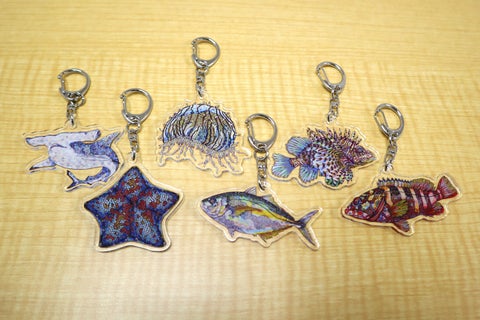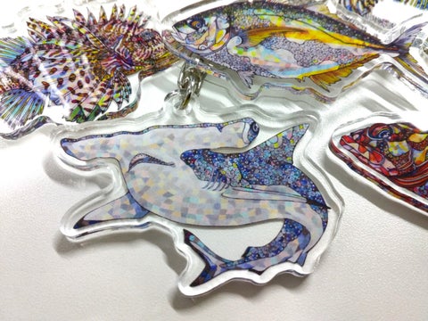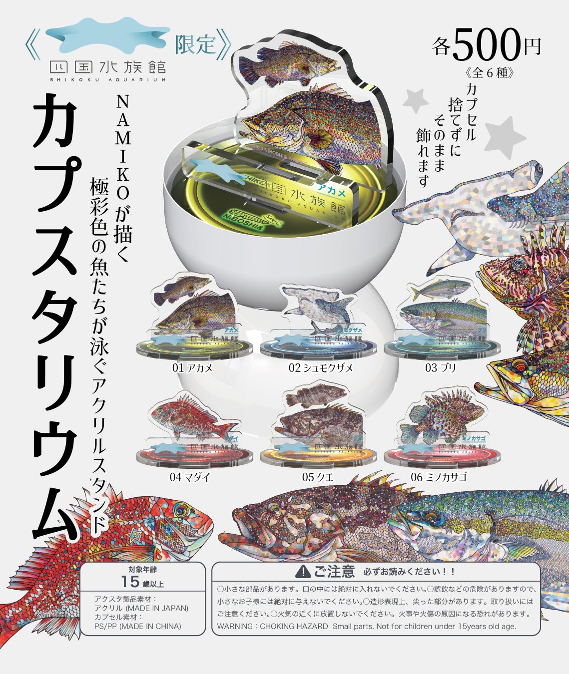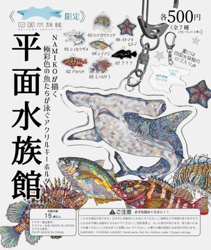 カプスタリウム(アクリルスタンド)と平面水族館キーホルダーの2種類があり、展示されている生き物の中からシュモクザメやアカメ、ハナガサケラゲなどが選ばれています。