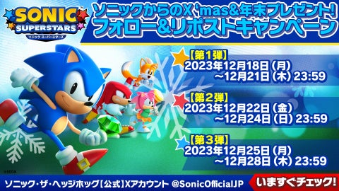 公式Xアカウントのフォローと、『ソニックスーパースターズ』のCM動画のリポストで豪華賞品が当たるキャンペーンが開催されています。