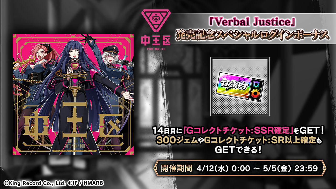 中王区のCD『Verbal Justice』の発売を記念したスペシャルログインボーナスを開催中です。ログインから14日目に「Gコレクトチケット:SSR確定」を入手できます。詳細はアプリ内お知らせをご確認ください。