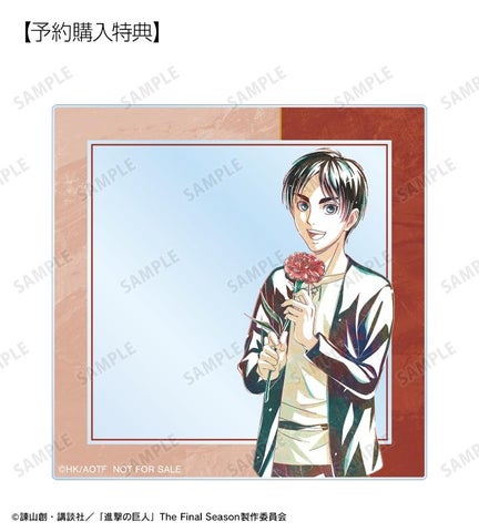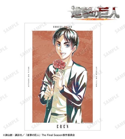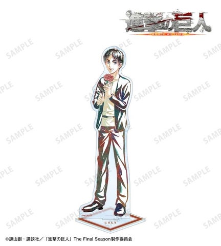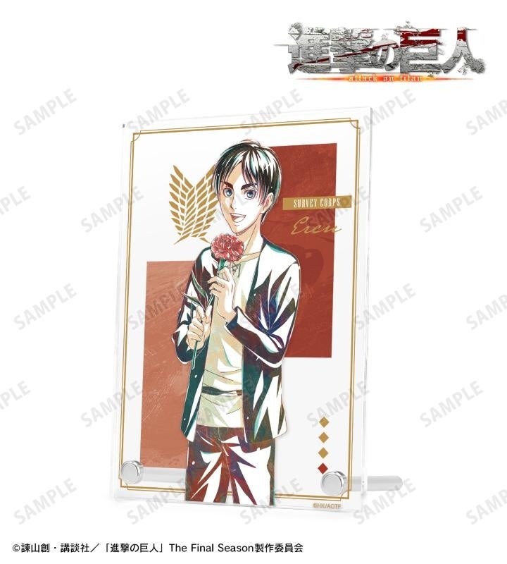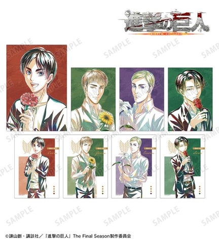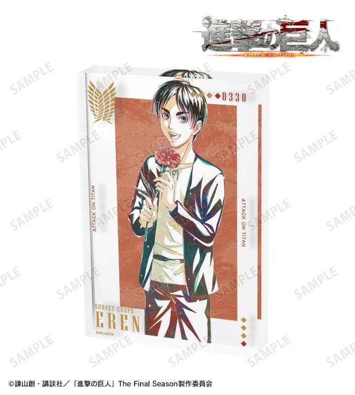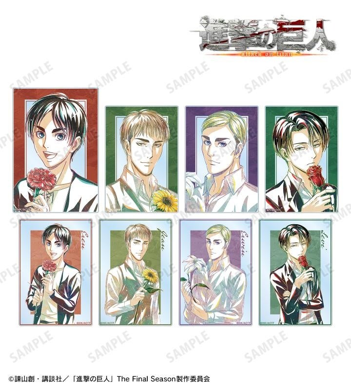 この商品は「日常で使える」キャラクターグッズで、エレン、ジャン、エルヴィン、リヴァイの描き下ろしイラストをアクリルカード、缶バッジ、ブロマイド、アクリルブロック、ダブルアクリルパネル、BIGアクリルスタンド、A3マット加工ポスターなどに仕上げました。