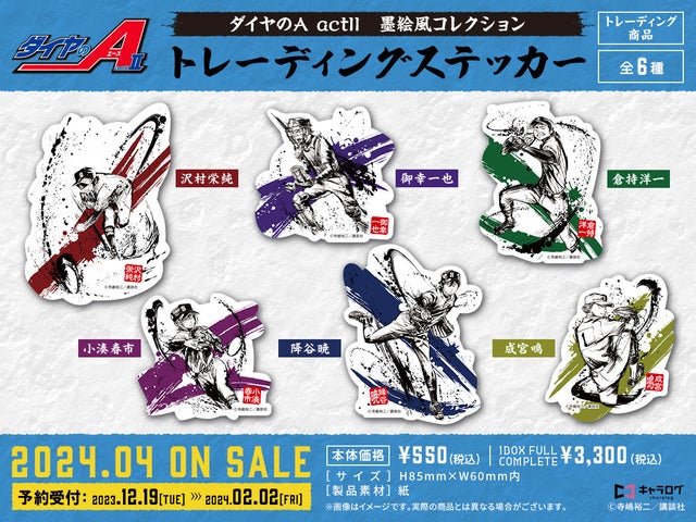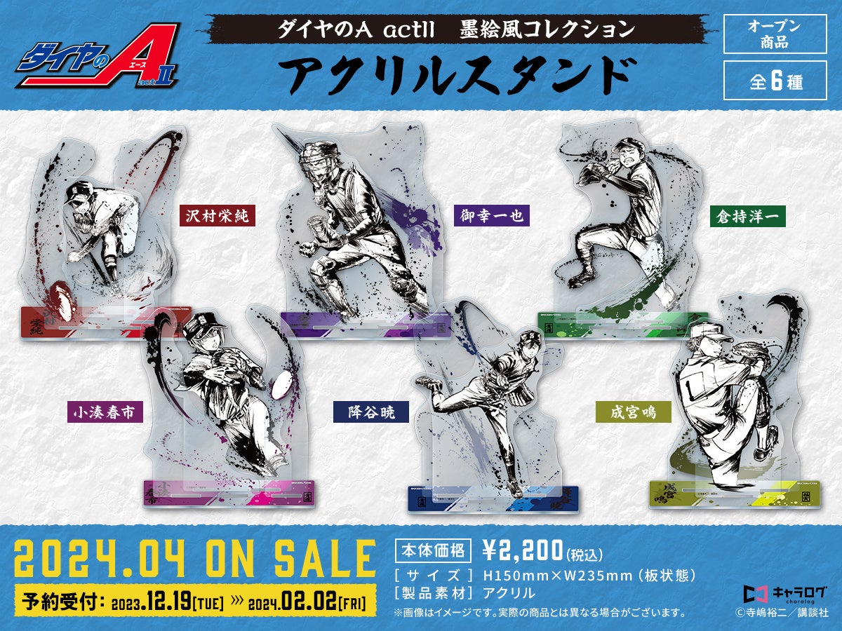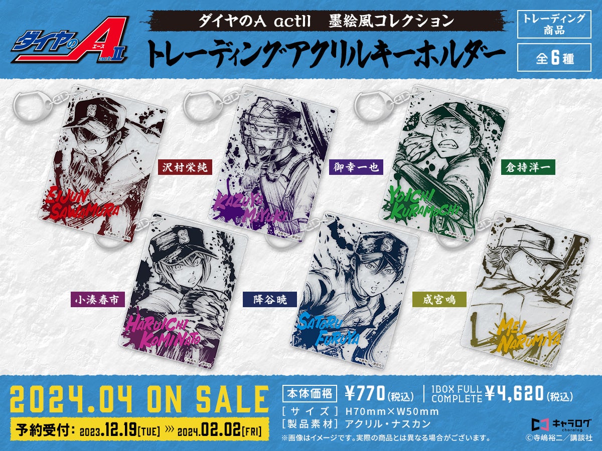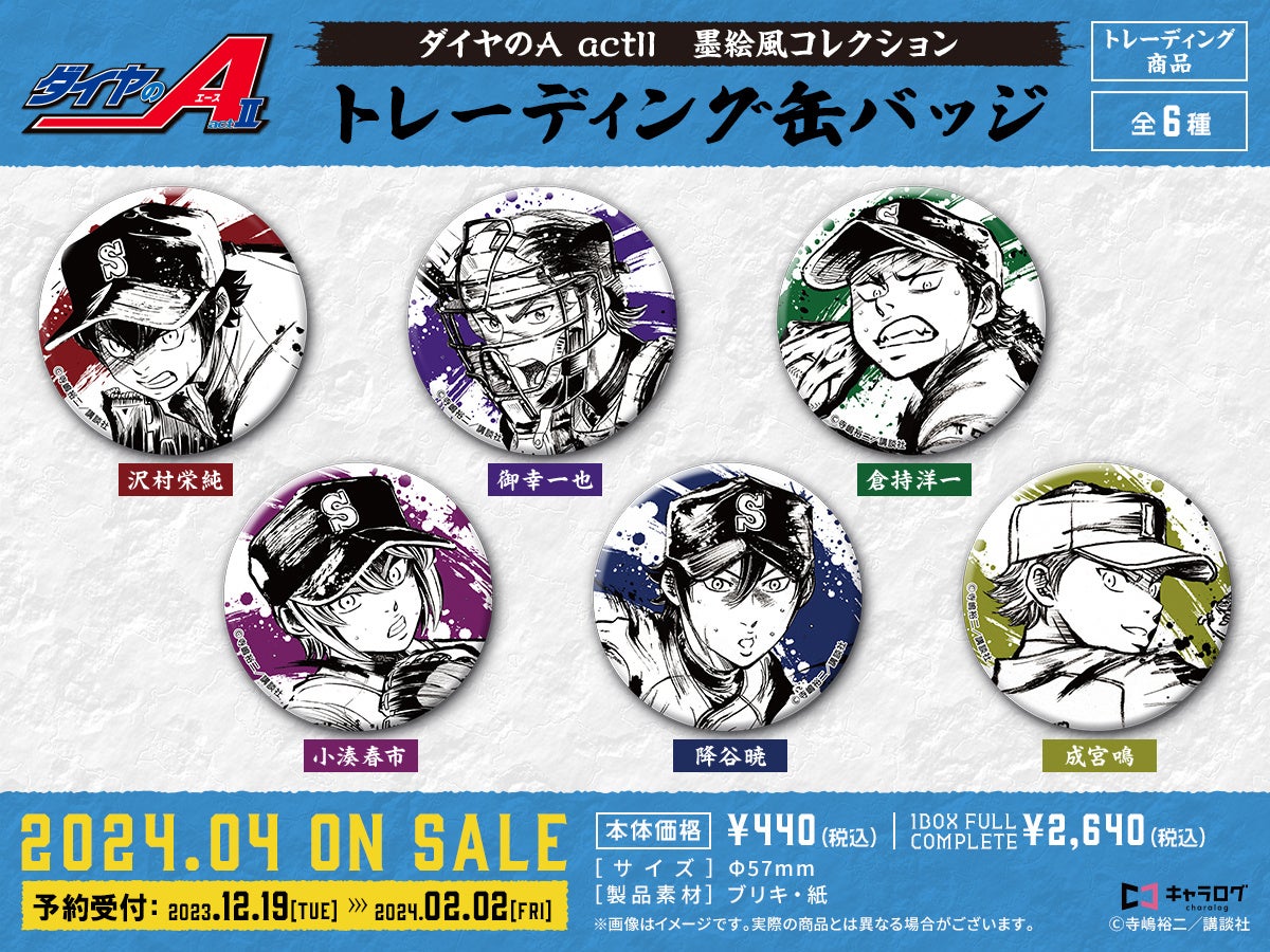 『ダイヤのA actII』から、墨絵風の加工と原作イラストを使用したオリジナルグッズが登場しました!トレーディング缶バッジやステッカー、アクリルキーホルダー、アクリルスタンド、原作アクリルポストカードなど、多種多様な商品が揃っています。