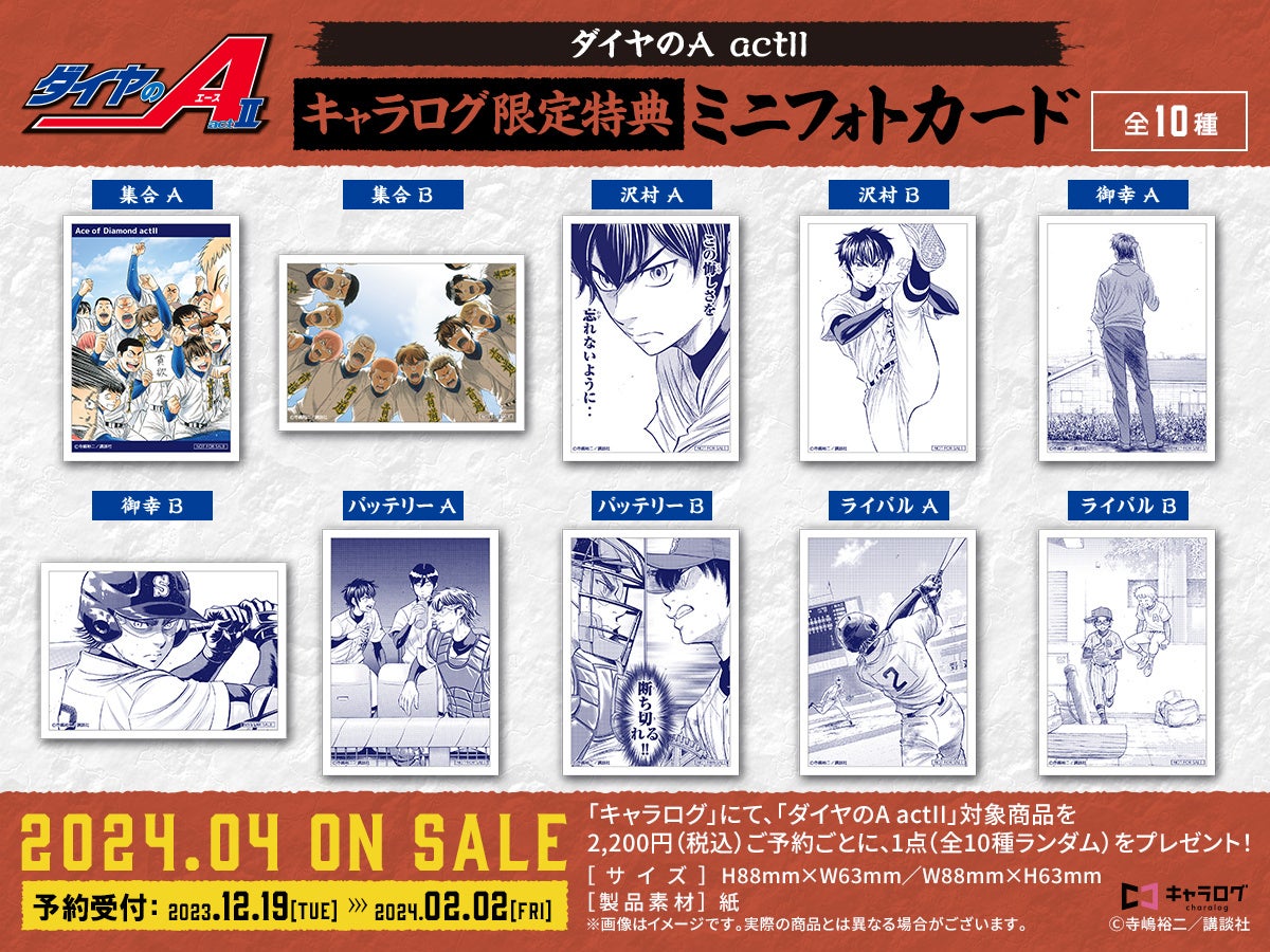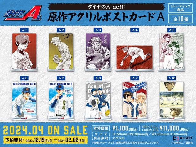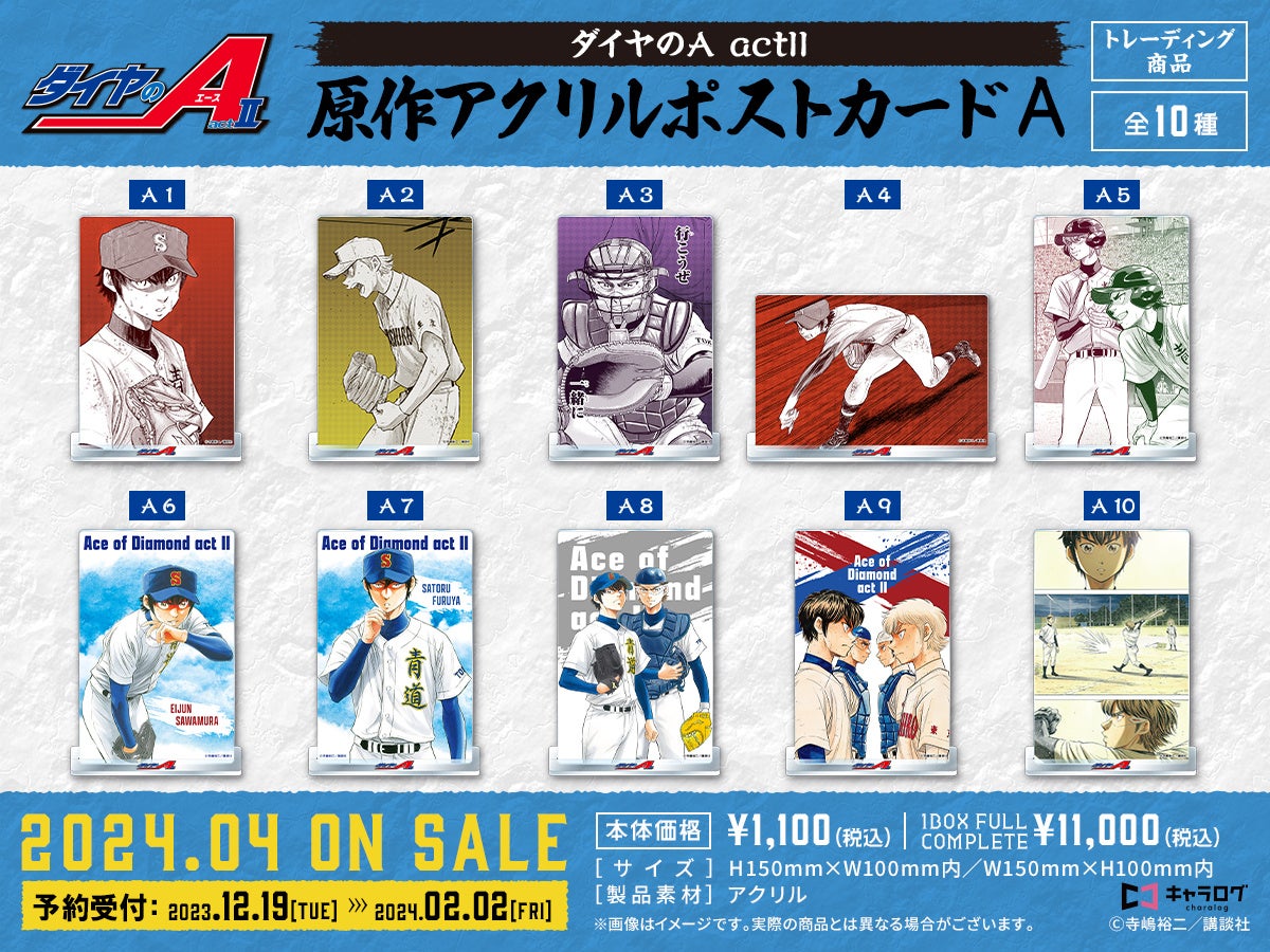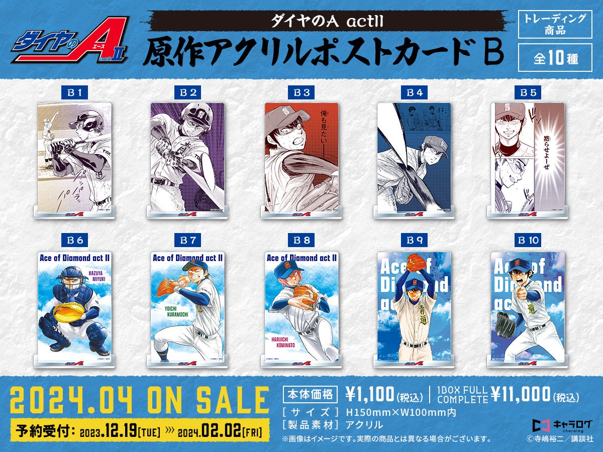 『ダイヤのA actII』から、墨絵風の加工と原作イラストを使用したオリジナルグッズが登場しました!トレーディング缶バッジやステッカー、アクリルキーホルダー、アクリルスタンド、原作アクリルポストカードなど、多種多様な商品が揃っています。