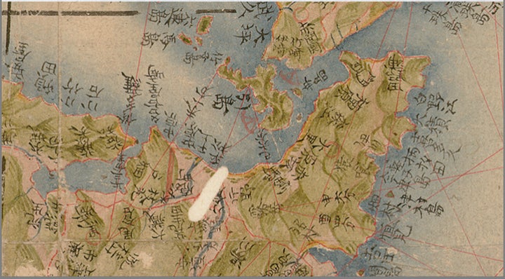この地図は伊能忠敬が製作した「大日本沿海輿地全図(だいにほんえんかいよちぜんず)」の副本であり、地図の製作工程でできた「針穴」や地図に押捺された「地図合印」を間近で見ることができます。