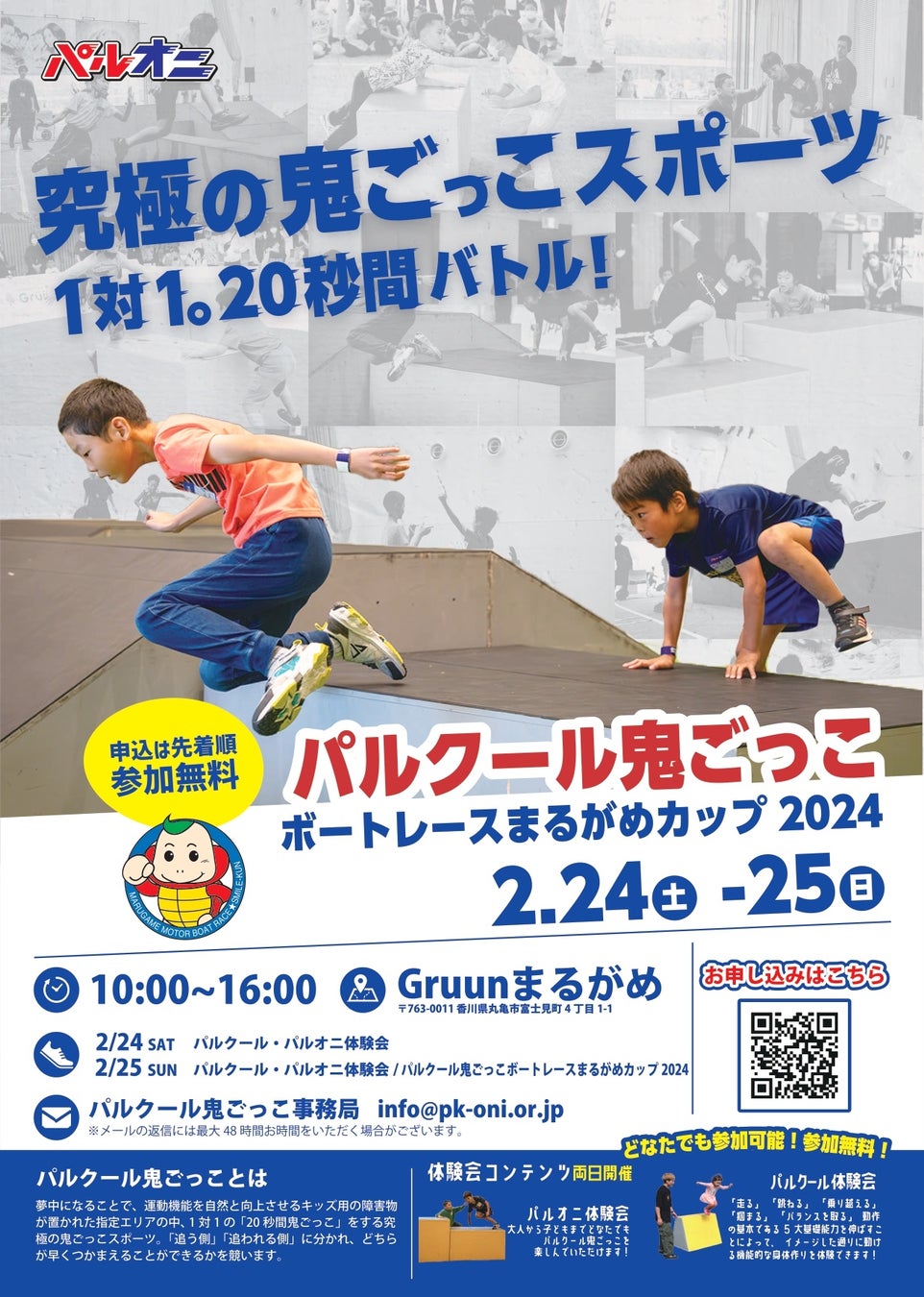 - 「パルクール鬼ごっこボートレースまるがめカップ2024」は小学生以下と保護者向けのイベント