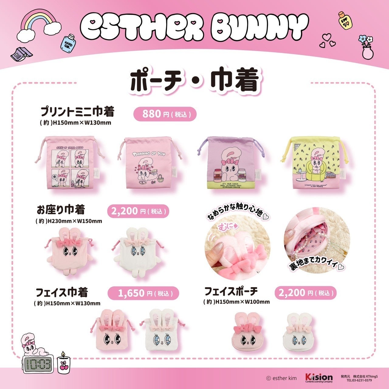 有楽町マルイ8Fで開催される『エスターバニー POPUP SHOP』では、日本限定のぬいぐるみやポーチ、ルームグッズ、韓国からのステッカーなど、幅広い種類の商品を取り揃えています。