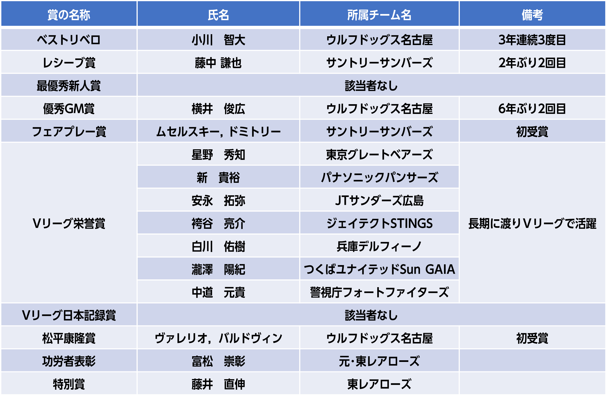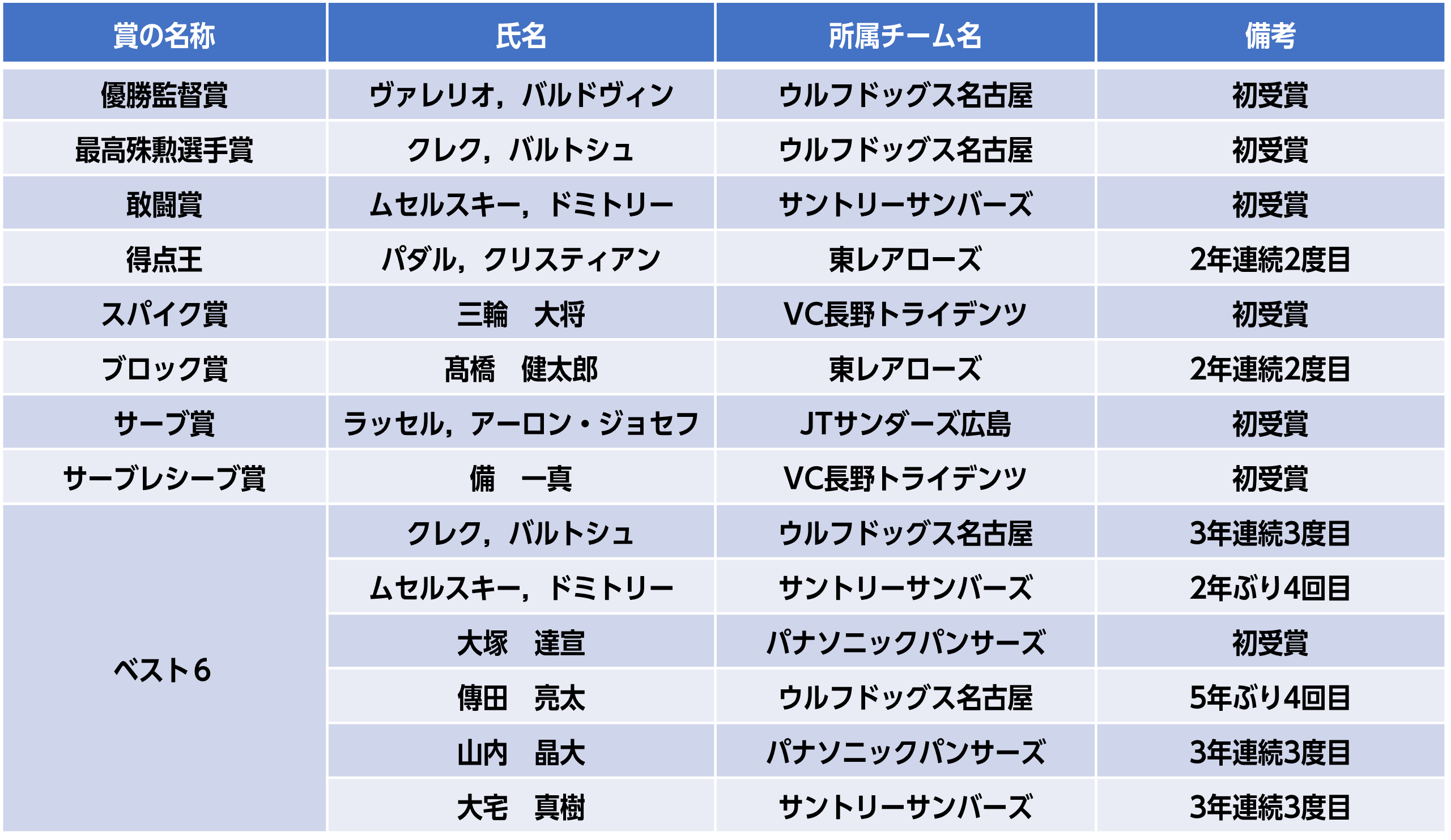 最高殊勲選手賞には、WD名古屋のキャプテン クレク,バルトシュ選手が初受賞を果たし、敢闘賞は、準優勝チームのサントリーのムセルスキー,ドミトリー選手が初受賞した。