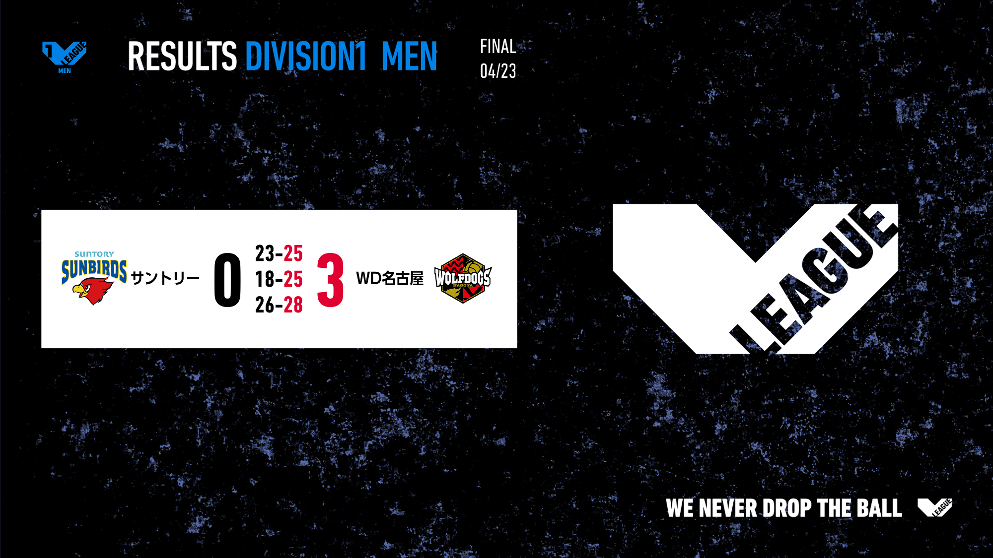 本日(4/23)、中央日本土地建物グループ presents 2022-23 V.LEAGUE DIVISION1 MEN V.FINAL STAGE FINALが国立代々木競技場第一体育館(東京都渋谷区)で行われ、ウルフドッグス名古屋がサントリーサンバーズに3-0(25-23,25-18,28-26)で勝利して、2022-23 V.LEAGUE DIVISION1 MENのチャンピオンとなりました。WD名古屋は7年ぶり2度目の優勝です。