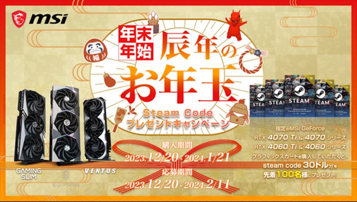 2023年12月20日から2024年1月21日までの期間中、MSI製品を購入し、オンライン登録すると、最大30ドル相当のSteamウォレットコードがもらえるキャンペーンが開催されます。
