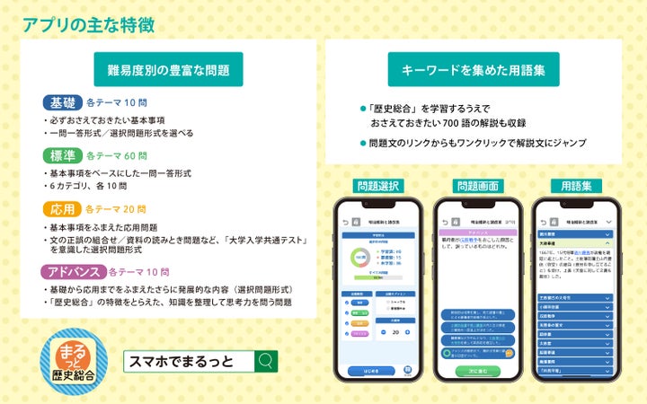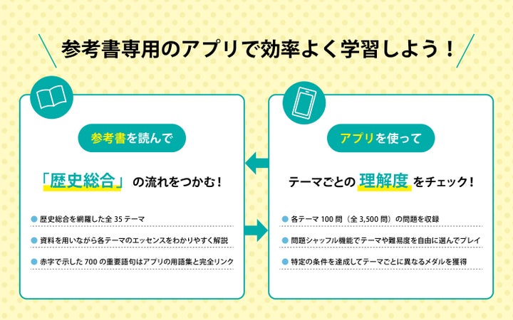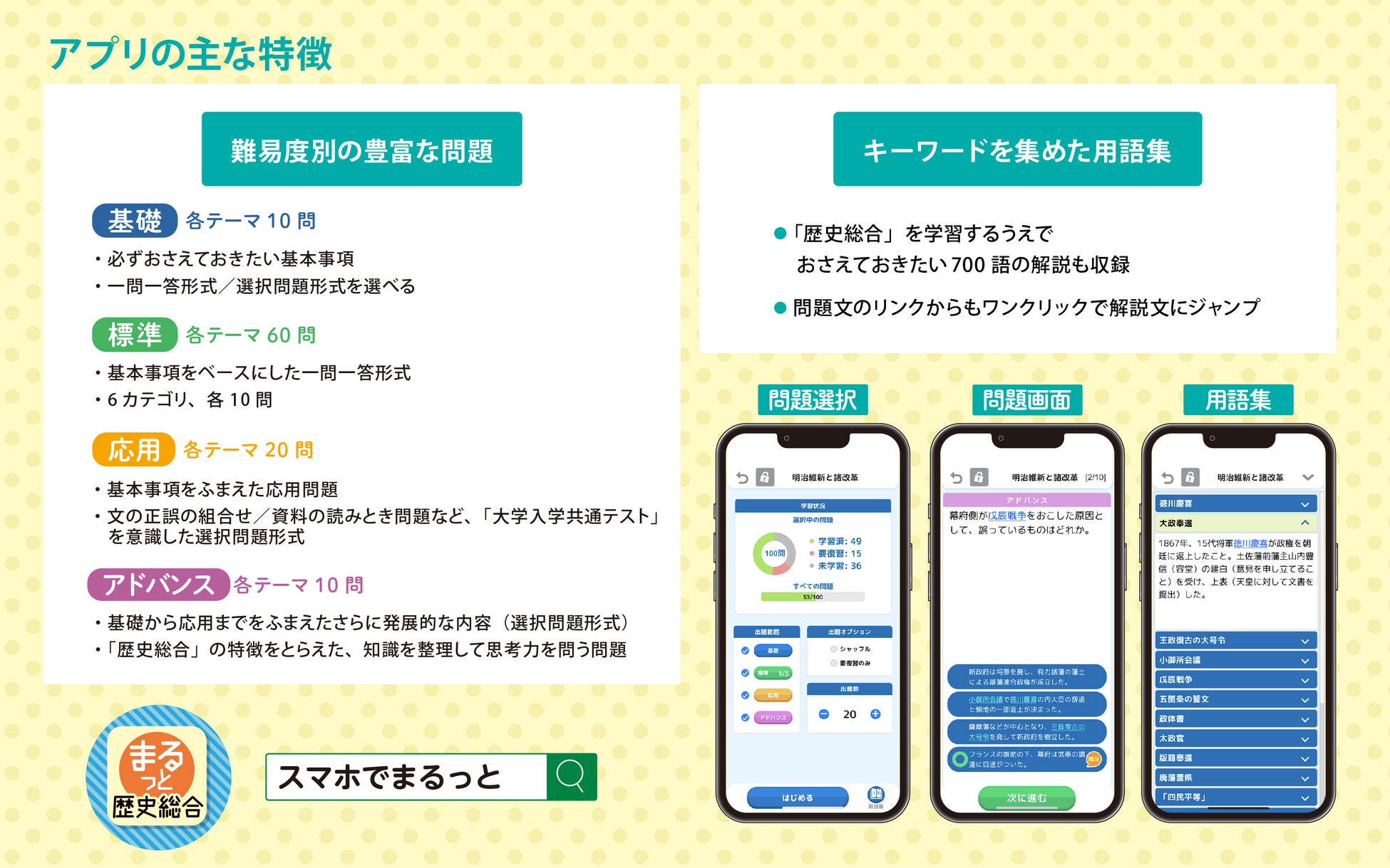 スキマ時間にスマホアプリで楽しみながら問題を解くと、一冊で「歴史総合」をマスターできます。