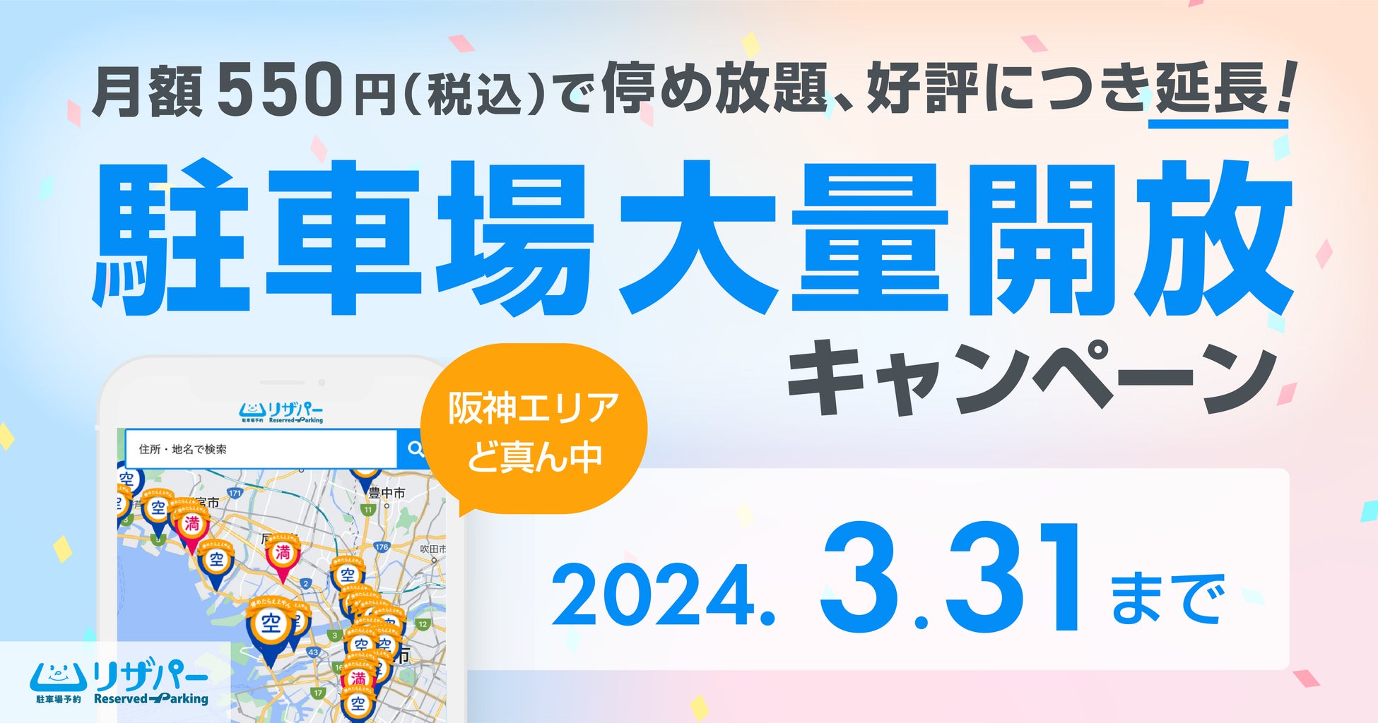 キャンペーンは2024年3月31日まで続き、いえらぶ駐車場会員は月額550円で阪神間エリアの駐車場を利用できます。
